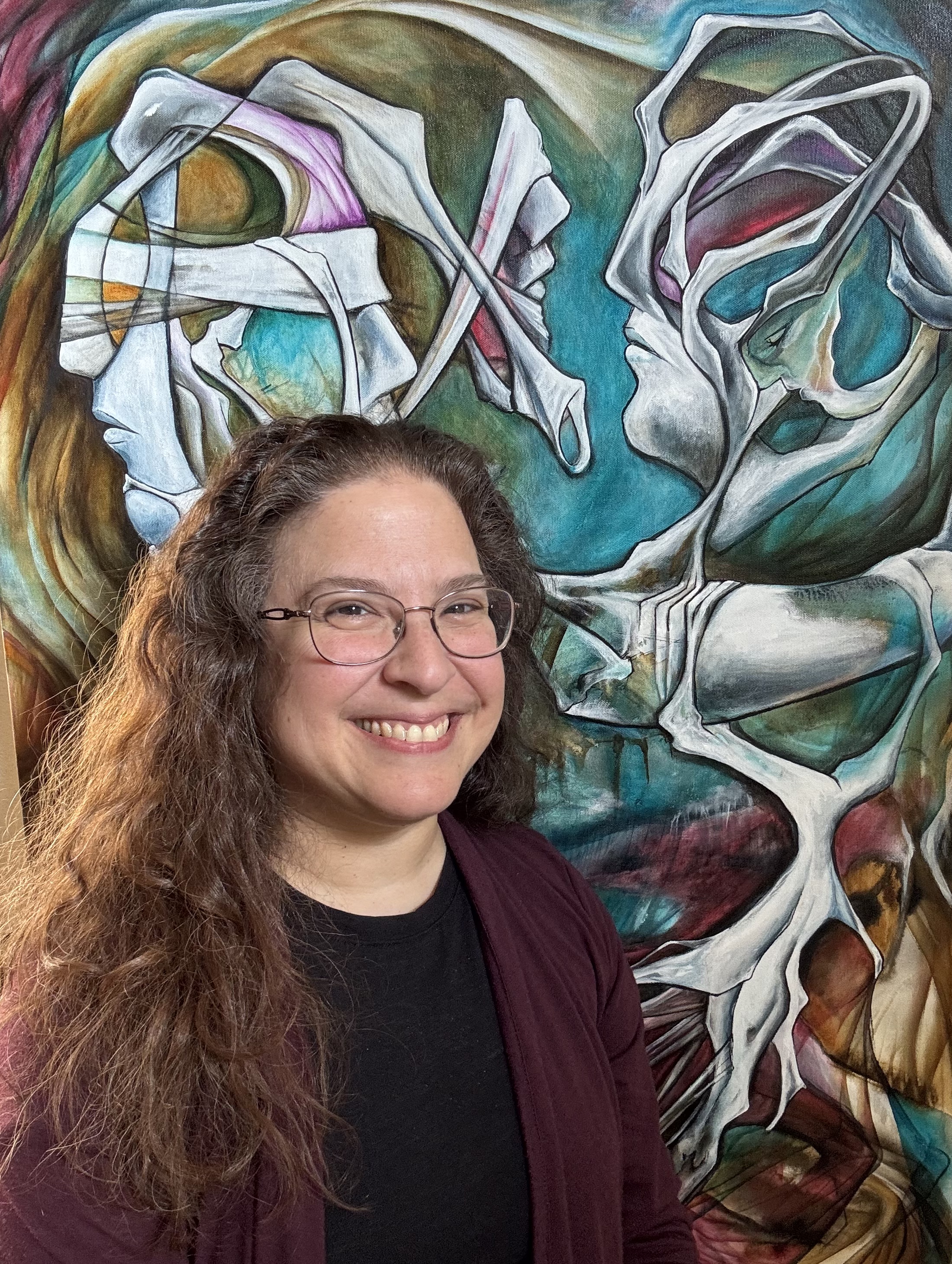 At this point in my journey, art has become a necessity. I put it away for years while my twins were younger, and once the pandemic hit I started painting and creating again non-stop. Painting honestly helps me get through my day. I work organically through layers of acrylic paint and line work to develop my imagery. I want my artwork to create a quiet space for you to slow down and take a moment for yourself to process what you need to. The world is intense and I think we need human made art to help us connect to others at this time.